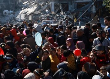 Twelve-year-old Do’a Atef spends her days knocking on doors begging for food, or gathering firewood from a dusty hill near a refugee camp outside Rafah, in southern Gaza, to cook the few tomatoes an...