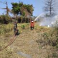 KARANGASEM – Babinsa Desa Baturinggit, Koramil 1623-08/Kubu Pelda I Gede Agus Wirya membantu proses pemadaman kebakaran lahan di Dusun Bat...