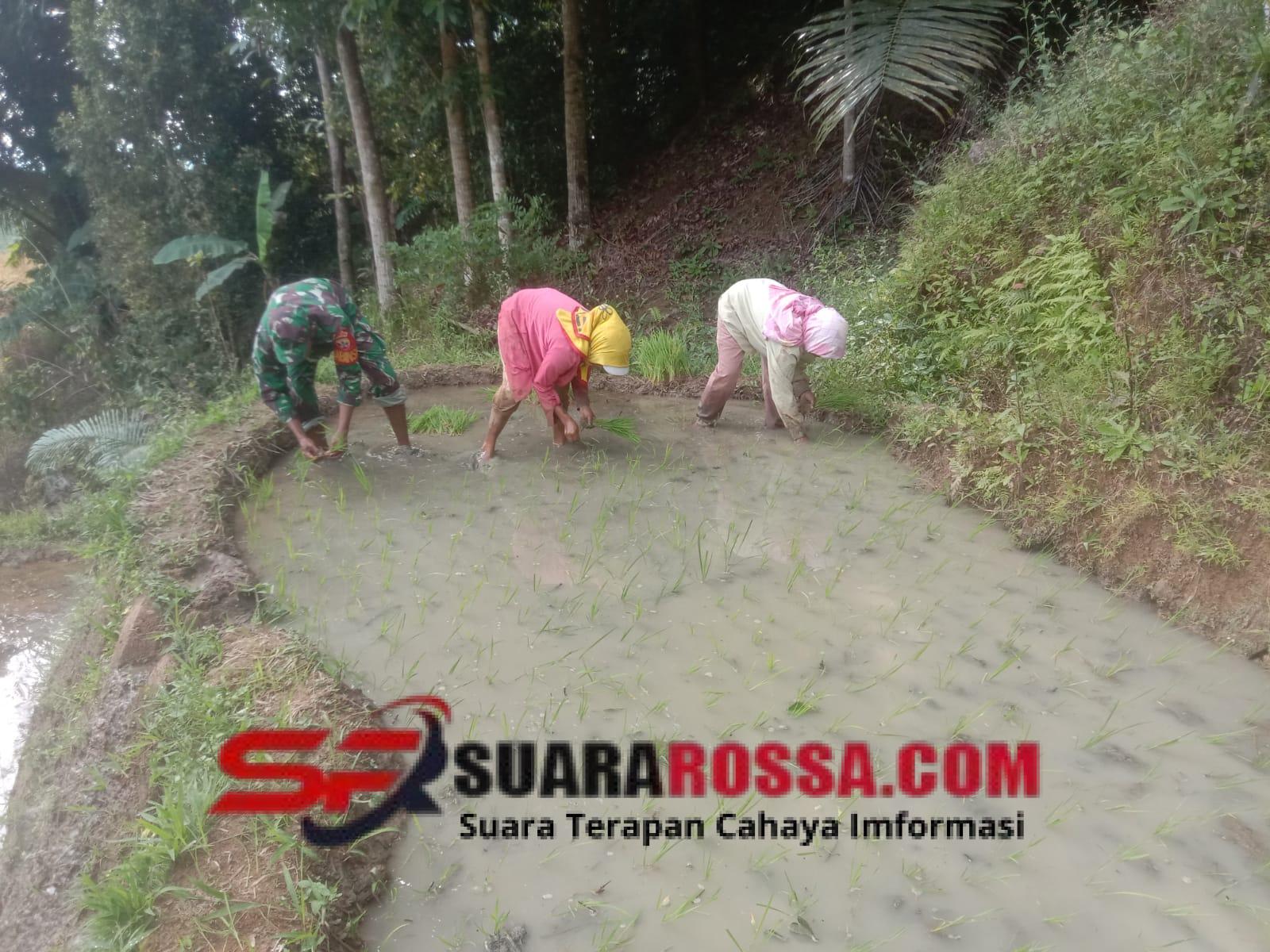 Aksi ini bukan sekadar formalitas; Serda Lalu secara aktif terlibat langsung, mulai dari mencabut bibit hingga menancapkannya satu per satu ke lumpur sawah yang telah disiapkan.
