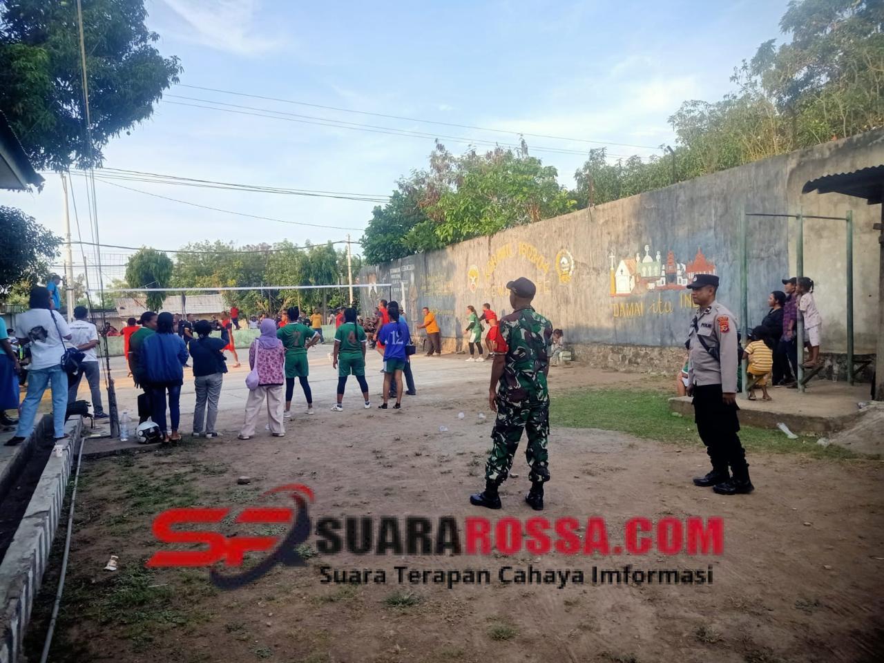 NTT-SIKKA. Anggota Koramil 1603-04/Kewapante Kodim 1603/Sikka, melaksanakan pengamanan kegiatan perlombaan bola voli antar puskesmas yang berlangsung di Lapangan Koramil Kewapante dalam rangka memperingati Hari Kesehatan Nasional (HKN), Sabtu(1/11/2025).