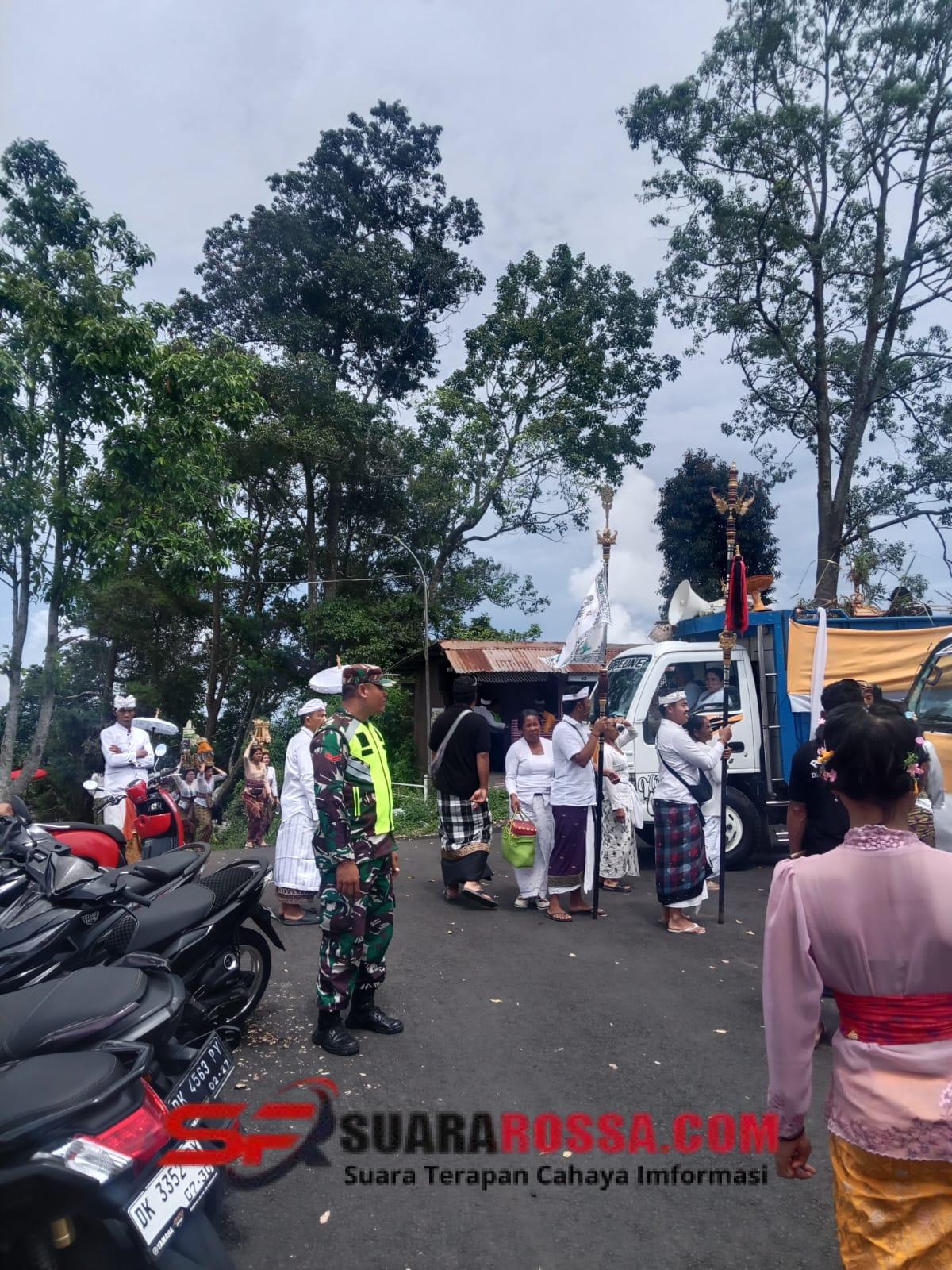 Bangli – Babinsa Desa Dausa, Koptu Made Sarjana, melaksanakan kegiatan pengamanan dan pengawalan Melasti Ide Sesunan Desa Adat Dausa ke Pura Purwasiddhi Ponjok Batu, sebagai bagian dari rangkaian Karya Ngusaba Desa di Pura Bale Agung Desa Adat Dausa, Kecamatan Kintamani, Kabupaten Bangli. Minggu (2/11/2025)