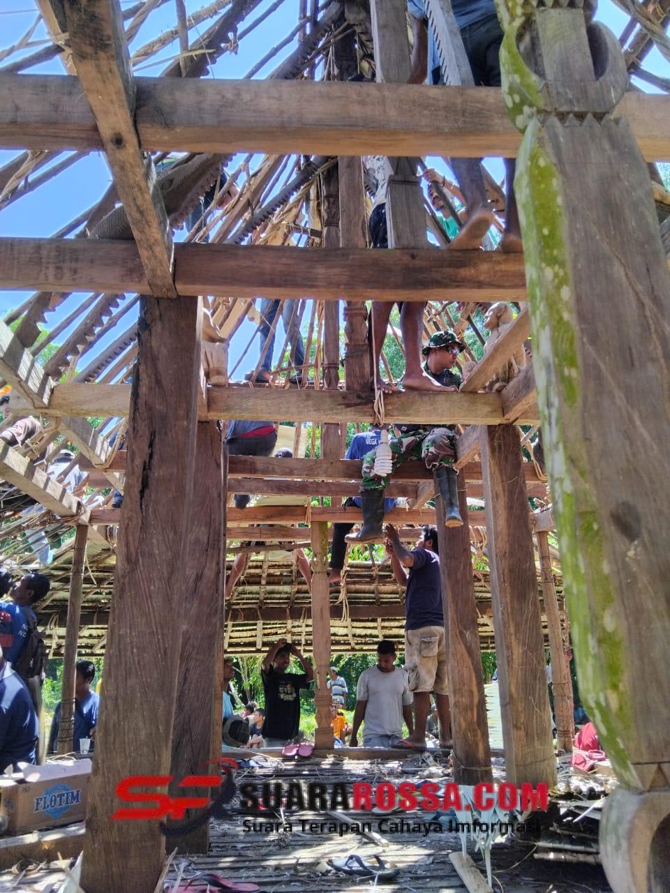 Kegiatan yang berlangsung sejak pagi ini berfokus pada pembongkaran dan pemasangan kembali atap korke atau rumah adat Desa Ratulodong yang menjadi simbol budaya dan kebanggaan masyarakat setempat. Warga tampak antusias dan bekerja bahu membahu bersama Babinsa dalam memperbaiki bangunan tradisional tersebut.