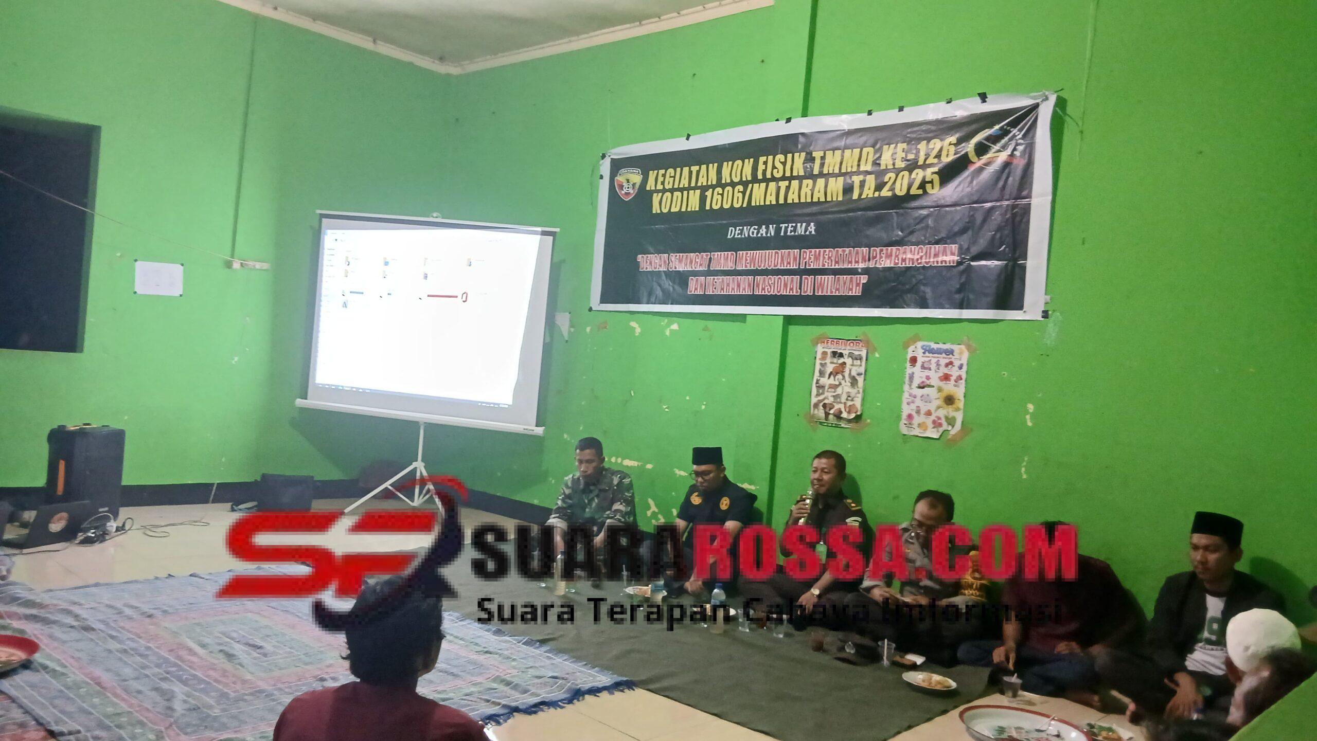 Lombok Barat, NTB, suararossa.com – Satgas TNI Manunggal Membangun Desa (TMMD) ke-126 Kodim 1606/Mataram terus menunjukkan komitmennya bukan hanya dalam pembangunan fisik, tetapi juga pembentukan karakter masyarakat. Melalui kegiatan non fisik, Satgas TMMD menggelar sosialisasi bahaya narkoba dan penyuluhan hukum di TK PAUD Al-Ahari, Dusun Murpeji, Desa Dasan Geria, Kecamatan Lingsar, Sabtu malam (1/11/2025).
