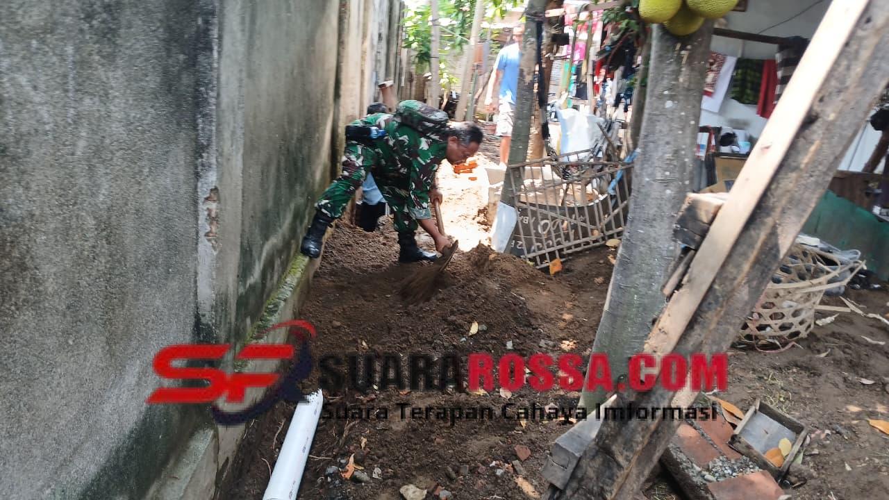 Dalam suasana penuh semangat kebersamaan, Babinsa bersama warga tampak bahu-membahu membersihkan dan memperbaiki saluran air yang tersumbat akibat endapan lumpur serta sampah rumah tangga. Tak hanya memberi arahan, Serka Agus turut turun langsung ke parit sempit di antara rumah warga, mengangkat tanah, dan membantu proses pemasangan batu bata saluran air.
