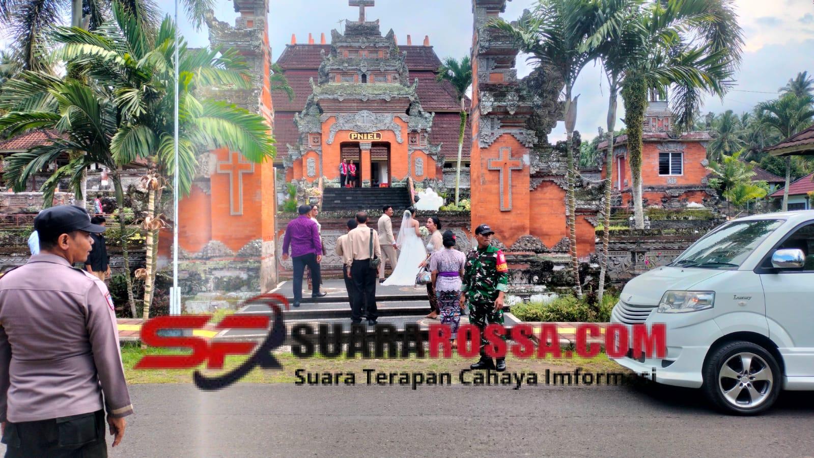 Babinsa Desa Blimbingsari, Serka Kd Wirawanta, bersinergi dengan Bhabinkamtibmas, Aiptu Wyn Suda, serta Relawan Gereja, bahu-membahu mengamankan jalannya Kegiatan Pemberkatan Pernikahan di Gereja GKPB Pniel Blimbingsari, Banjar Blimbingsari.