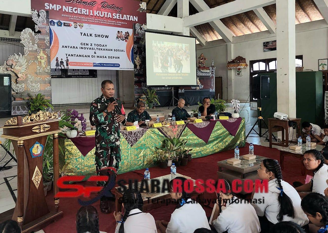 BALI – Badung, Batih Tuud Koramil 1611-08/Kuta Selatan, Serka Dominggus Mai Sila, menjadi narasumber dalam acara Talk Show bertajuk “Gen Z Today: Antara Inovasi, Tekanan Sosial, dan Tantangan di Masa Depan” di Aula SMPN 1 Kuta Selatan, Jl. Wanagiri, Kelurahan Jimbaran. Acara ini bertujuan untuk mengedukasi dan memberikan wawasan kepada siswa-siswi mengenai tantangan yang dihadapi oleh Generasi Z. Rabu, (12/11/25).