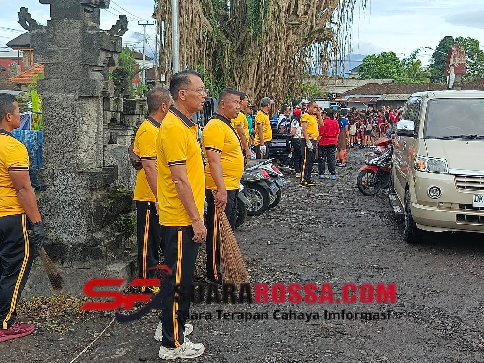 Jumat,(14/11/25),pukul 70.30 wita, Kapolsek Marga pimpin anggota mengikuti kegiatan bersih-bersih grebeg sampah bertempat di kawasan pasar tradisional marga.