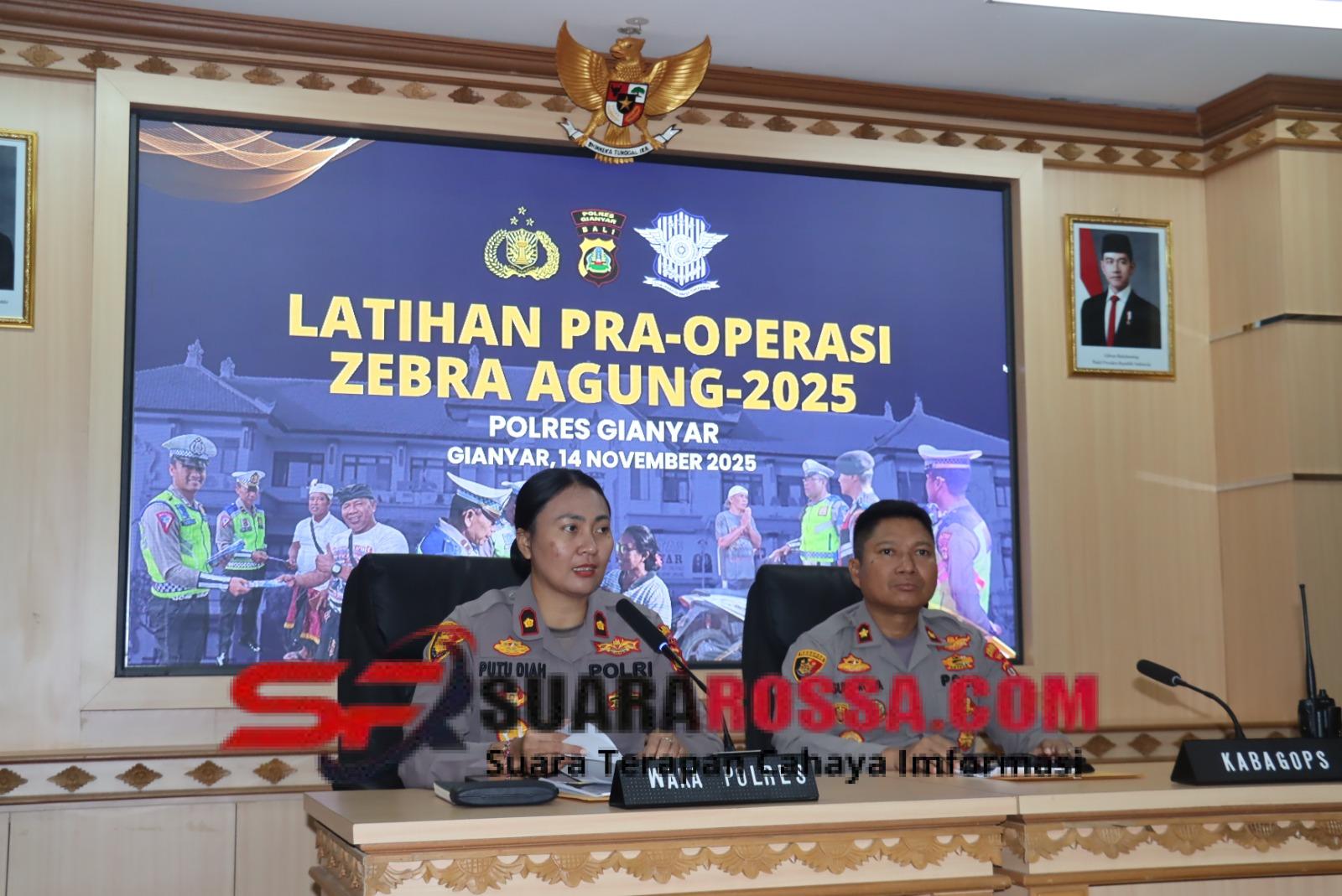 Polres Gianyar melaksanakan Latihan Pra-Operasi (Lat Pra) Zebra Agung Tahun 2025 pada Jumat (14/11/2025) di Rupatama Catur Prasetya Polres Gianyar. Kegiatan dipimpin oleh Wakapolres Gianyar Kompol Putu Diah Kurniawandari, S.H., S.I.K., M.H.