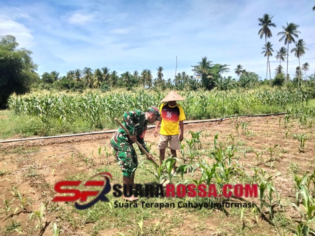 Sertu Soalihin secara langsung turun ke lahan, memberikan bimbingan dan bantuan teknis mengenai perawatan tanaman jagung. Fokus utama pendampingan yang dilaksanakan adalah membantu petani cara menggemburkan tanah di sekitar batang pohon jagung. Penggemburan tanah ini merupakan teknik krusial yang berfungsi untuk memperbaiki aerasi tanah, memudahkan akar menyerap unsur hara, dan pada akhirnya merangsang pertumbuhan batang dan buah jagung agar menjadi lebih besar dan optimal.
