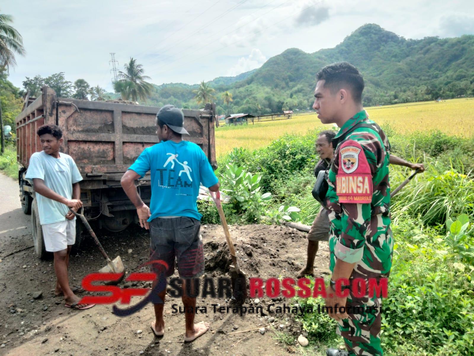 Pratu Paskalis Saputra Raja tampak berbaur dengan masyarakat, memberikan arahan serta memastikan semua pekerjaan berjalan lancar. Kehadiran Babinsa tidak hanya mempermudah pelaksanaan karya bakti, tetapi juga memberikan motivasi kepada warga untuk bekerja secara aman dan produktif.