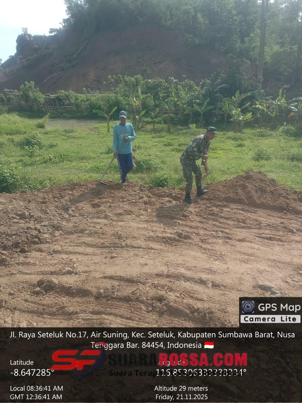 Sumbawa Barat, NTB – Dalam rangka mendukung kelancaran program pembangunan di wilayah, Babinsa Koramil 1628-03/Seteluk, Sertu Ruslin, melaksanakan pengawalan dan monitoring pekerjaan pengisian serta perataan tanah uruk untuk pembangunan Koperasi Merah Putih (KDKMP) di Desa Air Suning, Kecamatan Seteluk, Kabupaten Sumbawa Barat, Jumat (21/11/2025) pukul 08.00 Wita.
