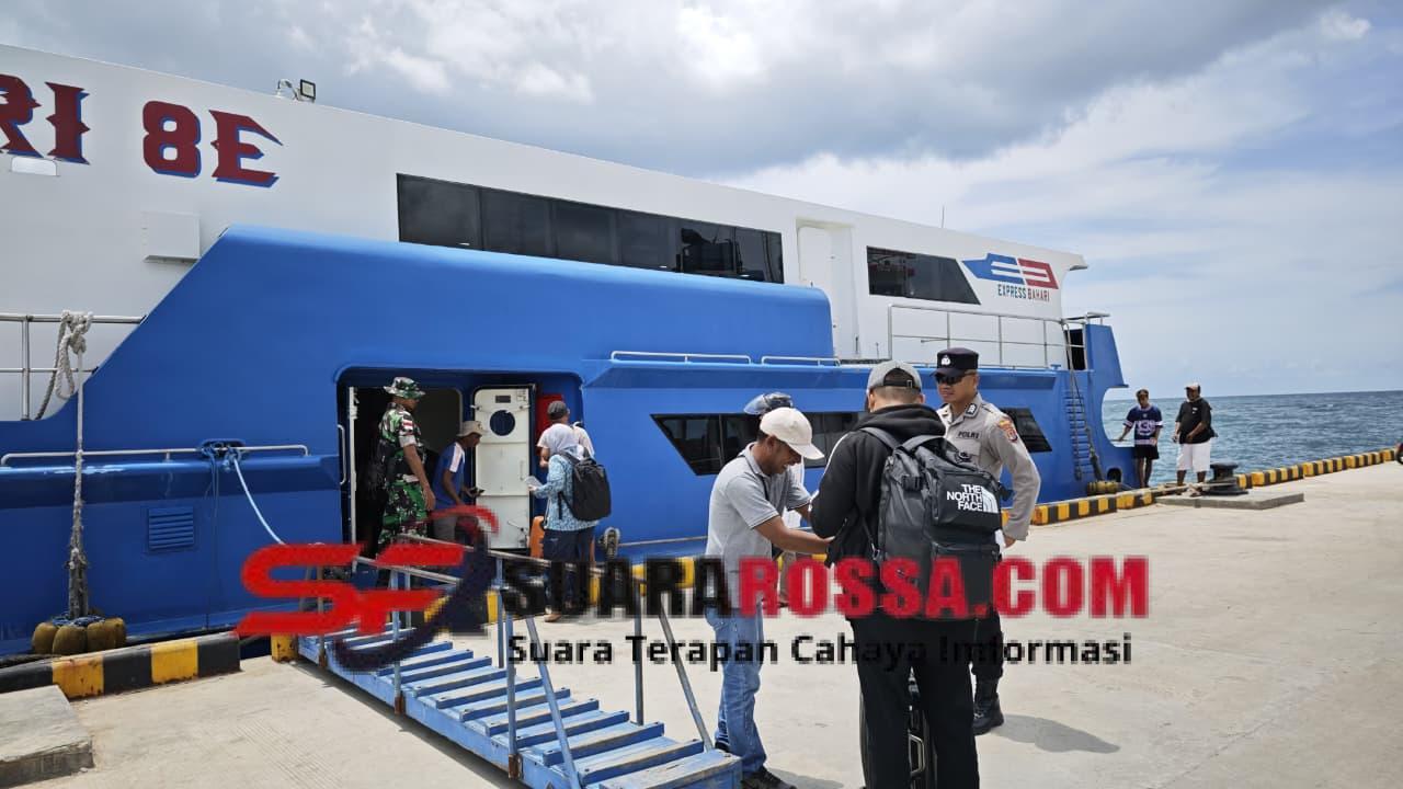 Pada pukul 11.15 WITA, kapal penumpang cepat Express Bahari 8E tiba dan sandar di Pelabuhan Ba’a. Kopda Hendra Gaspersz secara langsung memantau proses debarkasi penumpang, memastikan seluruh kegiatan berjalan sesuai prosedur serta tidak terjadi hambatan di lapangan. Arus penumpang yang turun berlangsung tertib, dan aktivitas pelayanan di pelabuhan berjalan dengan optimal.