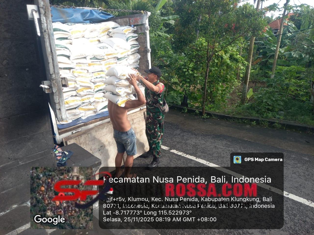 Klungkung,- Bertempat di Kantor Desa Klumpu, Kecamatan Nusa Penida, Kabupaten Klungkung, babinsa Klumpu Kopka Kadek Parta melaksanakan monitoring droping bantuan pangan beras dan minyak goreng program Penerima Bantuan Pangan ( PBP ) periode bulan Oktober dan Nopember 2025, Selasa ( 25/11/25 ).