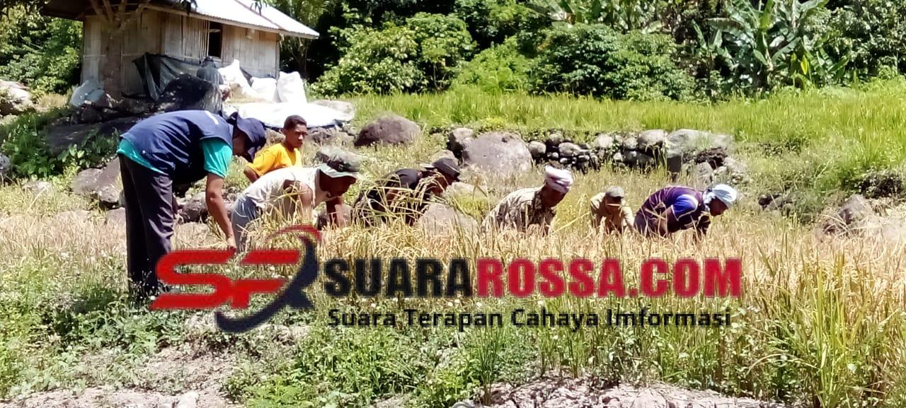 Ende, – Babinsa Koramil 1602-03/Detusoko, Serka Wagimin, bersama PPL Desa Dile, Ibu Mery Queen Shirley, melakukan kegiatan pendampingan panen padi di sawah milik Ibu Anastasia, warga Desa Dile, Kecamatan Detusoko, Kabupaten Ende.