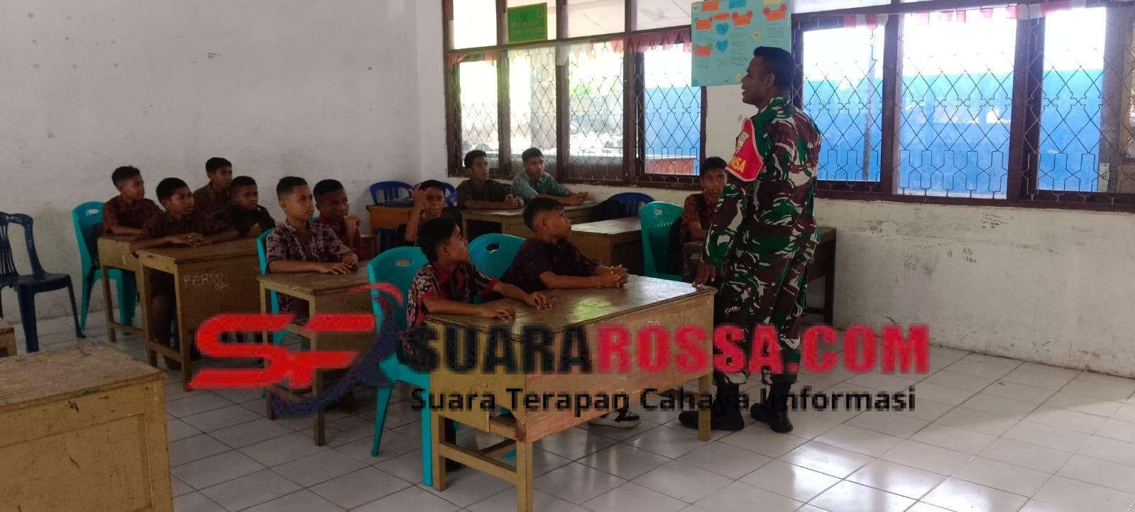 Ende, – Kopda Imanuel Lobang, Babinsa Ramil 1602-01/Ende, melaksanakan kegiatan Komunikasi Sosial (Komsos) dan Pengamanan Wilayah (Pamwil) bersama para pelajar di SMPN 1 Ndona, Kelurahan Lokoboko, Kecamatan Ndona, Kabupaten Ende, Kamis (27/11/2025) pukul 09.00 Wita hingga selesai. Kegiatan ini bertujuan untuk menjaga keamanan lingkungan sekolah, meningkatkan kedekatan TNI dengan generasi muda, serta menumbuhkan kesadaran akan pentingnya ketertiban dan disiplin dalam belajar.