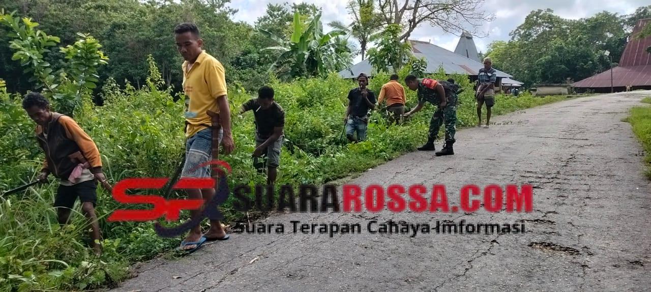 SUMBA BARAT – Babinsa Koramil 02/Walakaka, Kodim 1613/Sumba Barat, Serka Ramli bersama warga melaksanakan kegiatan gotong royong pembersihan jalan dari semak belukar yang menghalangi pandangan para pengguna jalan di Desa Bodohula, Kecamatan Lamboya, Kabupaten Sumba Barat, Jumat (28/11/2025).