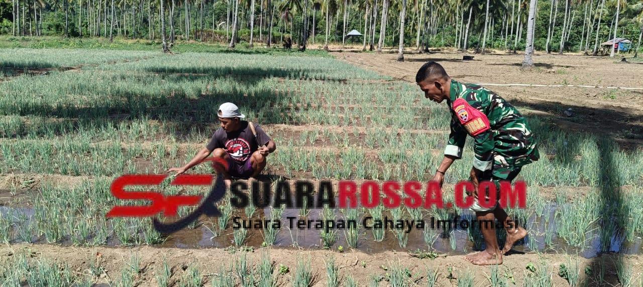 Dalam kegiatan tersebut, Babinsa ikut turun langsung membantu petani mengairi tanaman bawang di lahan pertanian. Kehadiran Babinsa bukan hanya untuk membantu pekerjaan fisik, tetapi juga untuk memberikan semangat dan dukungan kepada para petani agar tetap produktif.