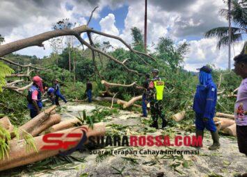 SUMBA TENGAH -Babinsa Koramil 03/Katikutana Kodim 1613/Sumba Barat, Kopda Nelson Tavares, ikut serta dalam proses evakuasi pohon tumbang yang menghalangi akses jalan di Desa Cendana, Kecamatan Mamboro...
