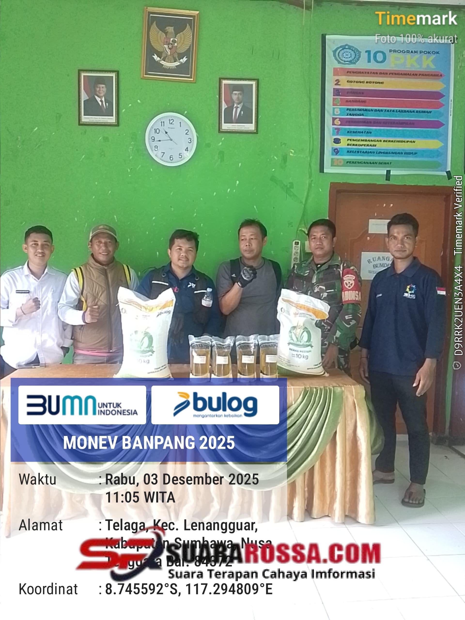 Sumbawa, NTB — Koramil 1607-03/Ropang terus menunjukkan komitmennya dalam memastikan setiap program pemerintah di wilayah binaan berjalan transparan dan tepat sasaran. Pada Rabu, 3 Desember 2025, Tim Banpang Bulog Sumbawa melaksanakan kegiatan Monitoring dan Evaluasi (Monev) Bantuan Pangan yang didampingi penuh oleh Babinsa Koramil 03/Ropang.