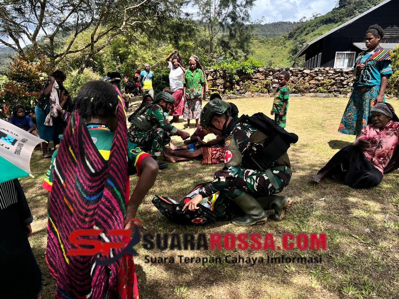 Prajurit Satgas Yonif 743/PSY memberikan pemeriksaan kesehatan, pembagian obat, serta edukasi tentang pola hidup bersih untuk mencegah penyakit yang sering menyerang masyarakat dataran tinggi.