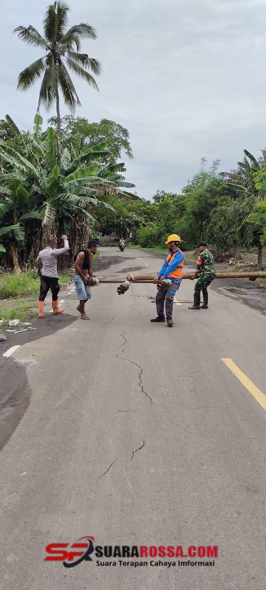 Selain itu, kegiatan dilanjutkan dengan penanganan tiang listrik tumbang yang berada di pinggir jalan. Tiang tersebut berpotensi membahayakan pengguna jalan dan mengganggu jaringan listrik, sehingga dilakukan pemindahan agar situasi kembali aman dan tidak mengganggu aktivitas warga.