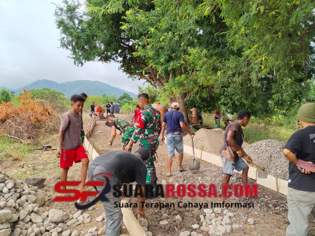 NTT-SIKKA. Anggota Koramil 1603-02/Talibura Kodim 1603/Sikka melaksanakan kegiatan karya bakti pembangunan jalan rabat sebagai sarana penting guna meningkatkan aksesibilitas bertempat di Desa Kringa, Kecamatan Talibura, Kabupaten Sikka, Kamis(4/12/2025).