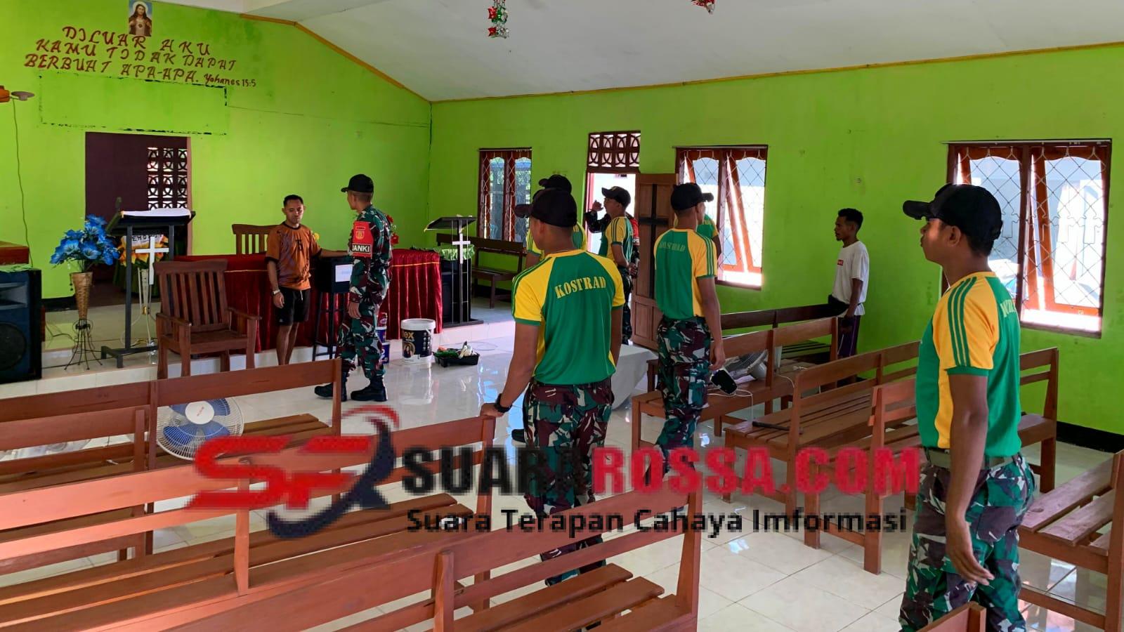 Personel Kompi I bersama warga bergotong royong membersihkan halaman, merapikan ruangan dalam gereja, serta memperbaiki bagian dinding yang mulai memudar. Proses pengecatan dilakukan untuk mempercantik tampilan gereja sehingga tampak lebih rapi dan layak digunakan untuk setiap kegiatan keagamaan.