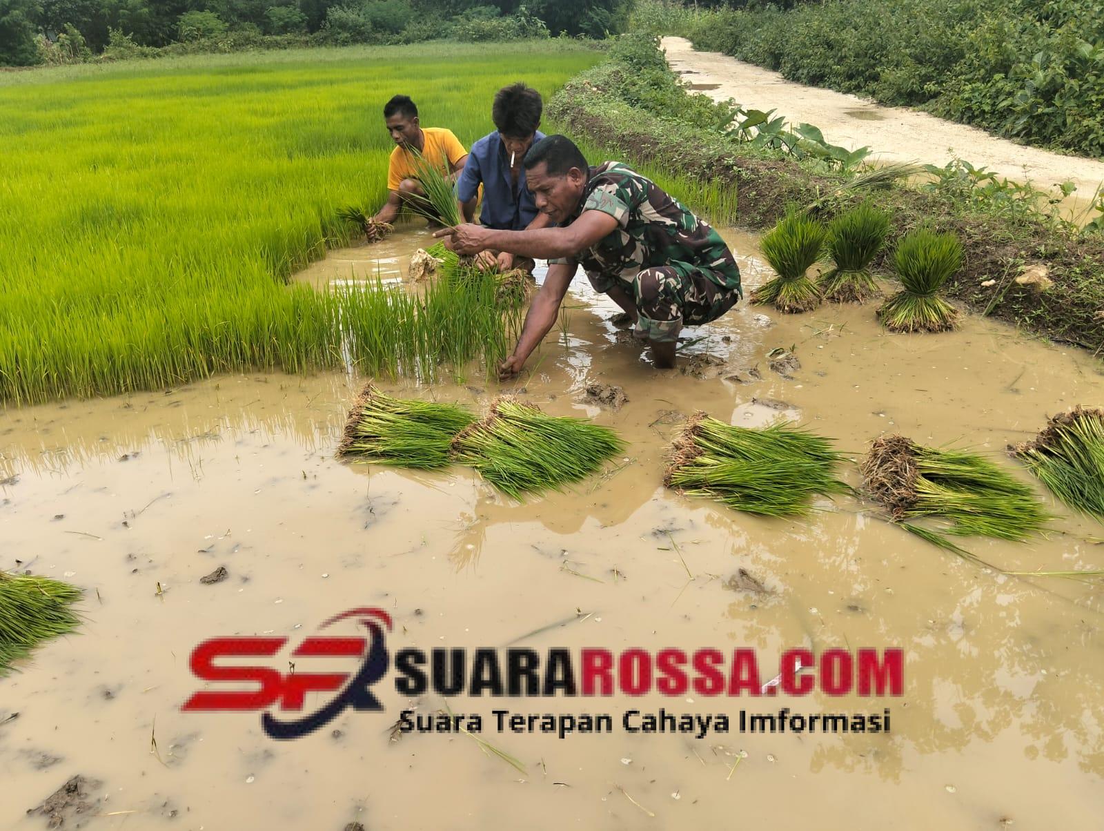 Dalam kesempatan tersebut, Sertu Samuel Lede Kalli turut membantu warga mencabut bibit padi yang akan dipindahkan ke lahan tanam.