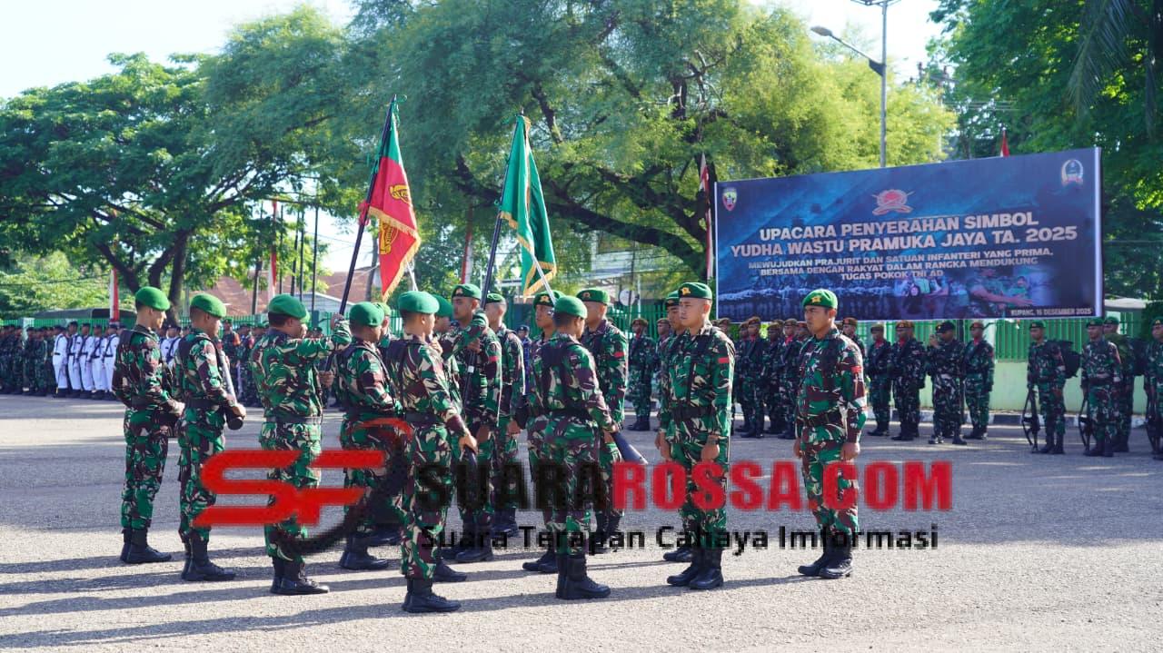 Kupang — Komandan Korem 161/Wira Sakti Brigjen TNI Hendro Cahyono memimpin langsung Upacara Penyerahan Simbol dan Pelepasan Peleton Beranting Yudha Wastu Pramuka Jaya dalam rangka memperingati Hari Juang TNI Angkatan Darat ke-80 Tahun 2025, yang digelar di Lapangan Makorem 161/Wira Sakti, Jl. W.J. Lalamentik, Oebufu, Kota Kupang. Selasa (16/12/2025).