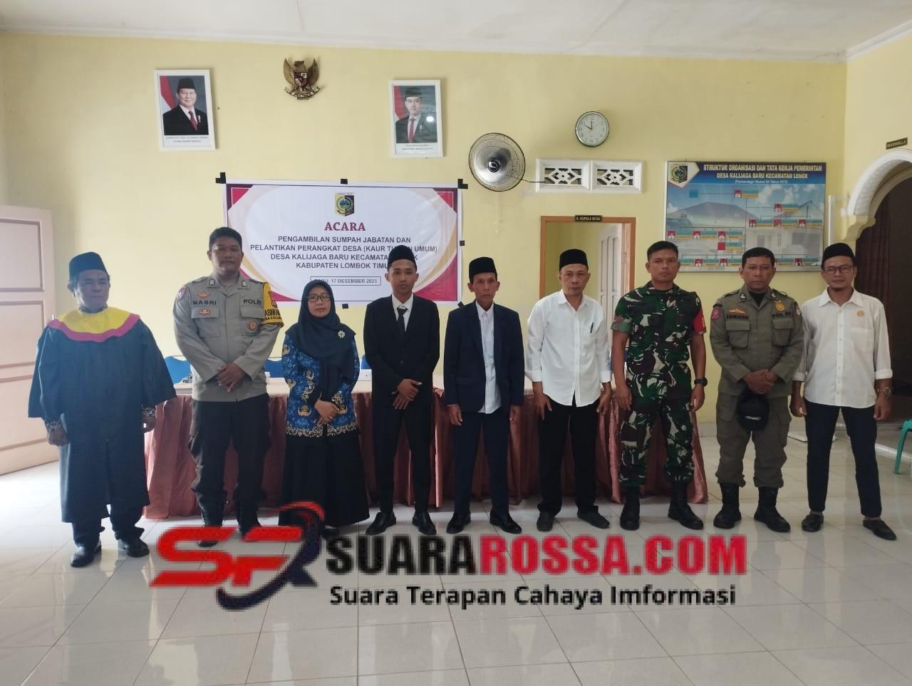 Lombok Timur — Babinsa Desa Kalijaga Baru, Kopda Hisbun Nasri, menghadiri acara Pengambilan Sumpah Jabatan dan Pelantikan Perangkat Desa (Kaur Tata Usaha dan Umum) yang berlangsung di Aula Kantor Desa Kalijaga Baru, Kecamatan Lenek, Kabupaten Lombok Timur.
