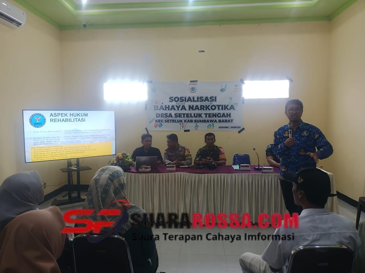 Sumbawa Barat, NTB – Sertu Dahlan, menghadiri kegiatan Sosialisasi Bahaya Narkoba tingkat Desa Seteluk Tengah yang diselenggarakan oleh Badan Narkotika Nasional (BNN) Kabupaten Sumbawa Barat. Kegiatan berlangsung di aula Kantor Desa Seteluk, Kecamatan Seteluk, Kabupaten Sumbawa Barat. Rabu (17/12/2025).