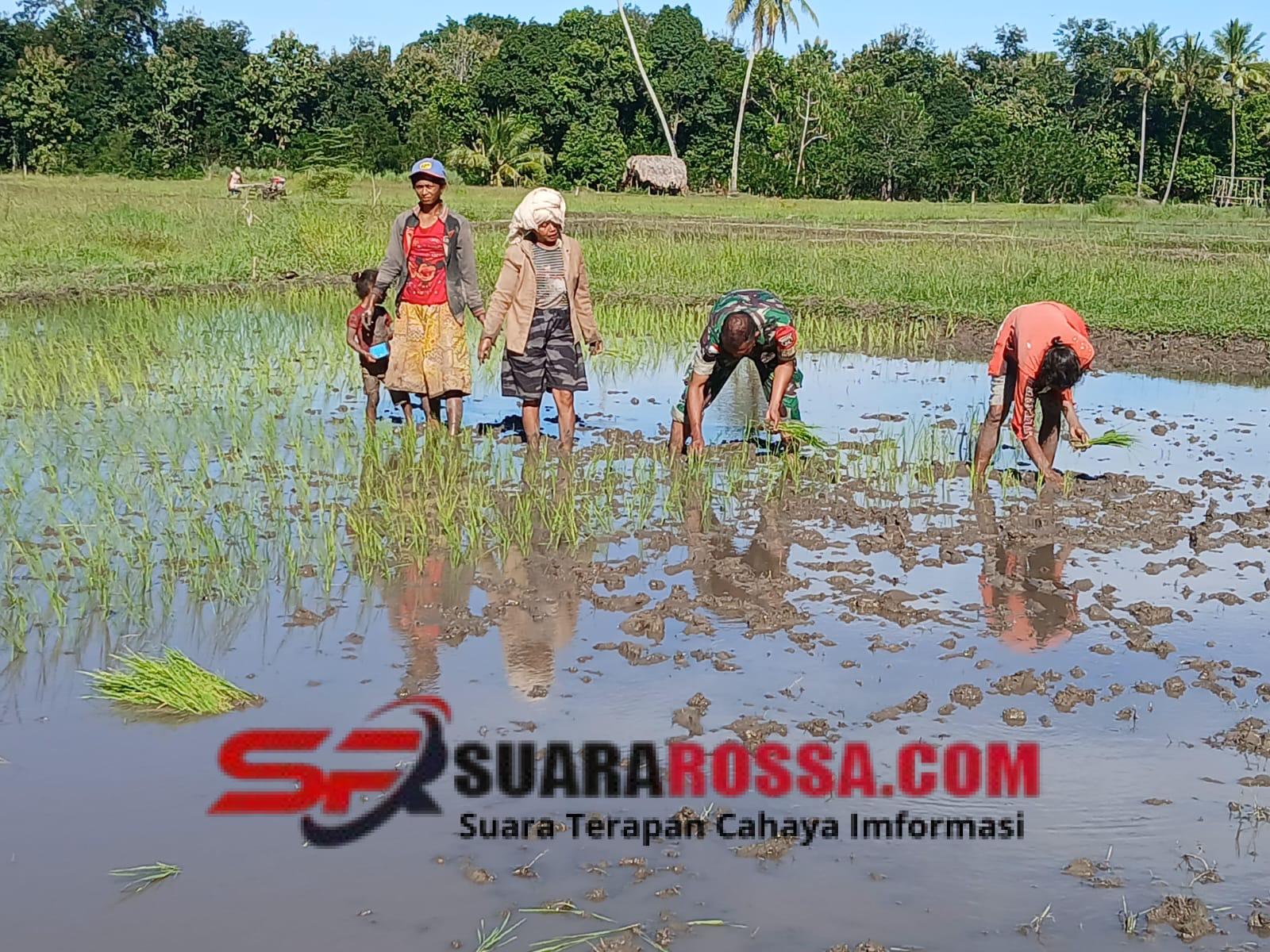 Tidak hanya berdiri mengawasi, Serka Yohanes Banfatin ikut membungkuk, memegang bibit padi, dan menanamnya satu per satu bersama para petani. Aktivitas ini dilakukan sebagai bentuk pendampingan dan dukungan moril kepada masyarakat agar tetap semangat mengelola lahan pertanian, khususnya di tengah tantangan cuaca dan keterbatasan sarana pertanian yang masih dihadapi warga desa.