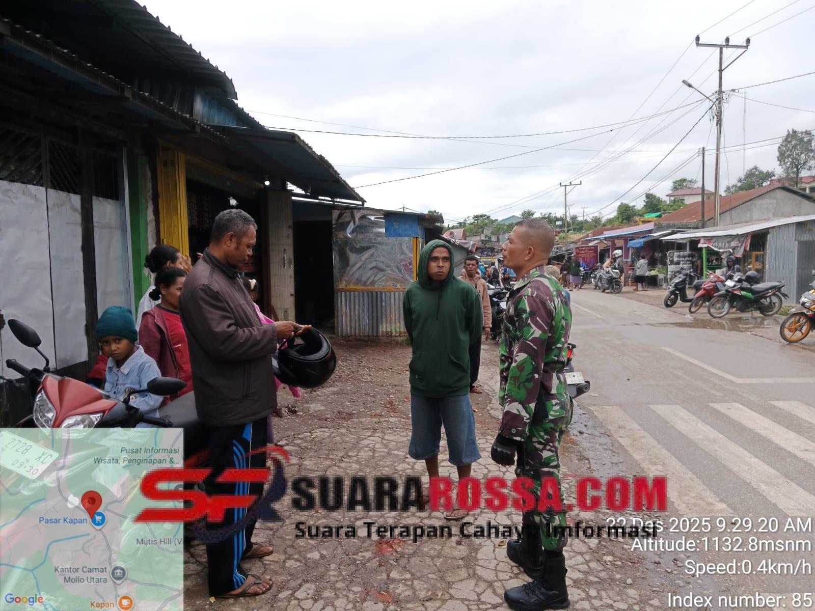 Mollo Utara, TTS – Dalam rangka menciptakan situasi wilayah yang aman, tertib, dan kondusif, anggota piket Koramil 1621-03/Mollo Utara melaksanakan kegiatan penertiban serta imbauan keamanan kepada masyarakat di seputaran Pasar Kapan, Kecamatan Mollo Utara, Senin (22/12/2025).