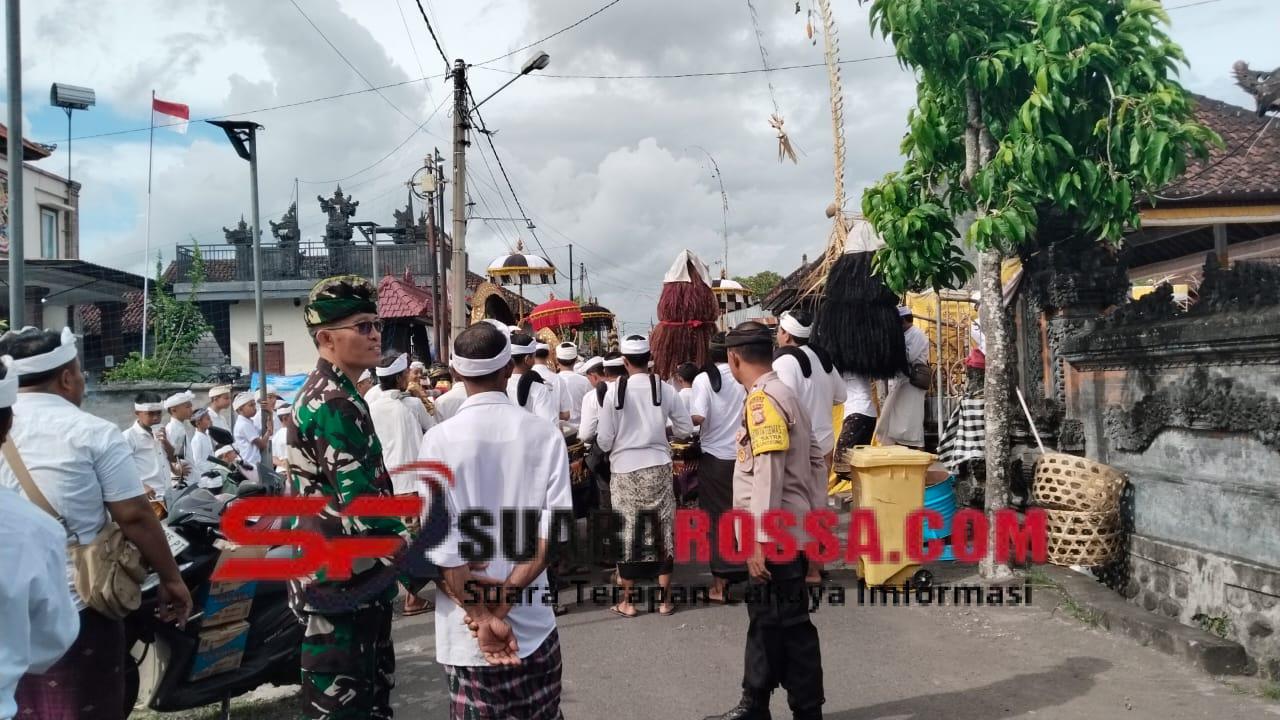 Klungkung,- Aparat Babinsa Satra Serka Gusti Ngurah Armawan bersama Bhabinkamtibmas dan Bankamda serta pecalang melaksanakan pengawalan dan pengamanan upacara ngerebeg desa dan napak pertiwi sesuhunan Ratu Gede Desa Satra, Rabu ( 24/12/25 ).