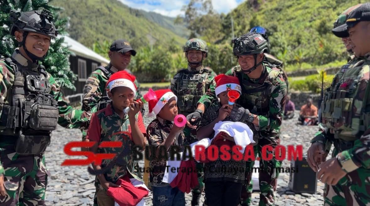 Menyambut sukacita Hari Raya Natal 2025, Satgas Yonif 743/PSY Pos Pintu Angin menghadirkan kebahagiaan bagi masyarakat dengan menyerahkan bingkisan Natal dan pohon Natal kepada Gereja Berkat Muara, Distrik Muara, Kab. Puncak Jaya, Papua, Rabu (24/12/2025).
