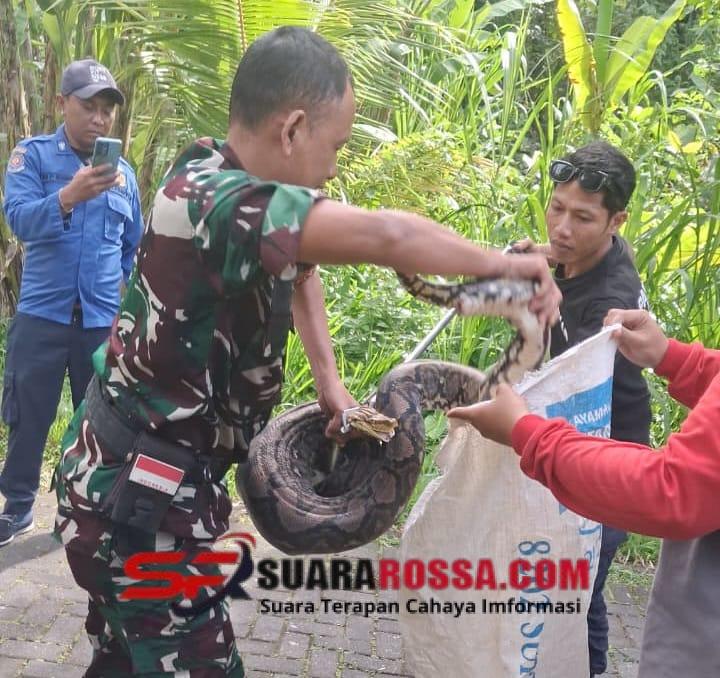 Setibanya di lokasi, Babinsa bersama petugas Damkar langsung melakukan evakuasi dengan penuh kehati-hatian. Ular berhasil diamankan dengan cara dikeluarkan dari kandang dan dimasukkan ke dalam karung khusus untuk selanjutnya diamankan. Ular sanca kembang tersebut diperkirakan memiliki panjang kurang lebih 2,5 meter dengan berat sekitar 10 kilogram.