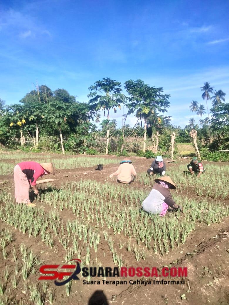 Bukan sekadar kunjungan formal, Sertu Soalihin tampak cekatan membantu warga membersihkan rumput liar (gulma) yang mengganggu pertumbuhan tanaman bawang merah. Langkah ini dilakukan guna memastikan nutrisi tanah terserap maksimal oleh tanaman, sehingga potensi gagal panen dapat diminimalisir.
