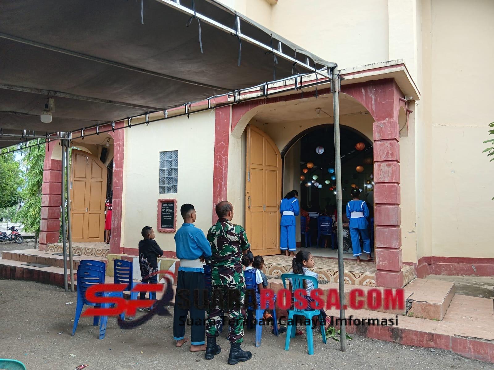 Sertu Soares tampak siaga di pintu gereja, memantau situasi sekaligus menyapa umat dengan sikap ramah. Kehadiran Babinsa bukan hanya sebagai aparat pengamanan, tetapi juga sebagai bagian dari masyarakat yang ikut menjaga keharmonisan dan toleransi antarumat beragama di wilayah binaannya.
