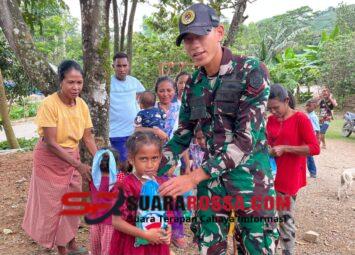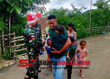 Satgas Pamtas RI–RDTL Sektor Timur Yonarmed 12 Kostrad melalui Pos Fohululik melaksanakan kegiatan Berbagi Keceriaan dalam rangka perayaan Natal dengan membagikan hadiah kepada anak-anak di Desa Foh...