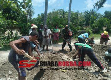 KODIM 1605/BELU, Babinsa Desa Motaain Koramil 1605-09/Biudukfoho Sertu Yohanes Delu bersama masyarakat melakukan penimbunan jalan utama Desa yang rusak di Dusun Dusun Motaain, Desa Motaain, Kecamatan ...