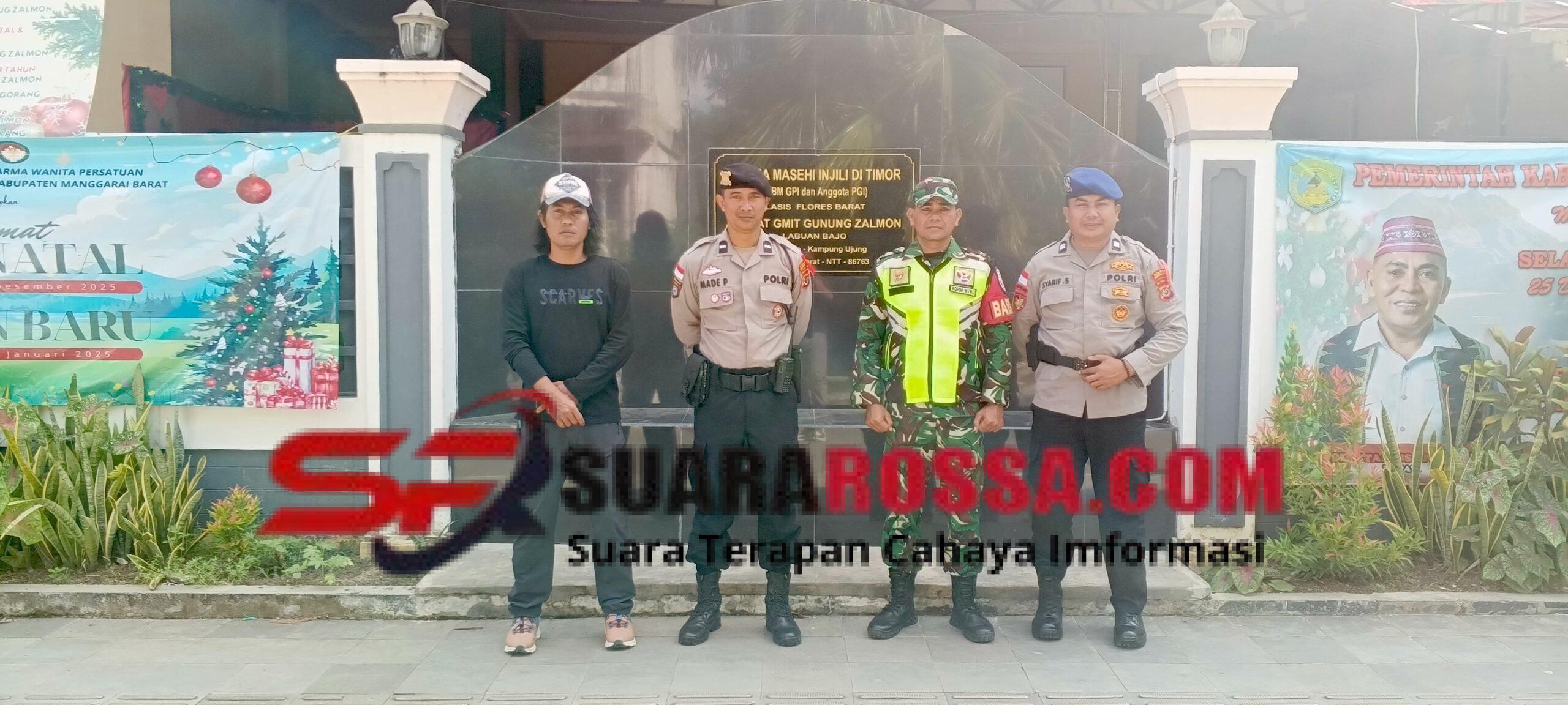 Labuan Bajo – Dalam rangka memberikan rasa aman dan nyaman kepada umat Kristiani yang melaksanakan ibadah, anggota Koramil 1630-01/Komodo Kodim 1630/Manggarai Barat melaksanakan pengamanan Ibadah Natal dan Tahun Baru 2026, Kamis, 1 Januari 2026, bertempat di Gereja Masehi Injil di Timor (GMIT), Kelurahan Labuan Bajo, Kecamatan Komodo, Kabupaten Manggarai Barat.