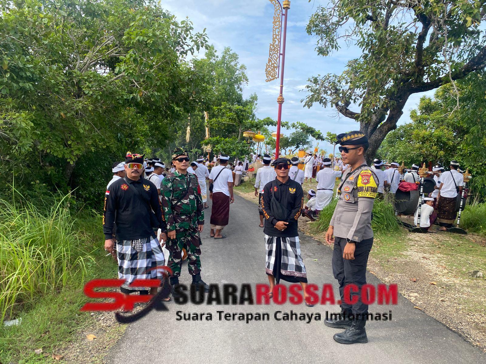 Klungkung,- Babinsa Bunga Mekar Koramil 1610-04/Nusa Penida, Sertu Ketut Suantara bersinergi Bersama Bhabinkamtibmas dan pecalang menggelar pengawalan dan pengamanan upacara keagamaan Pujawali di Pura Paluang / Pura Mobil, Sabtu ( 03/01/26 ).