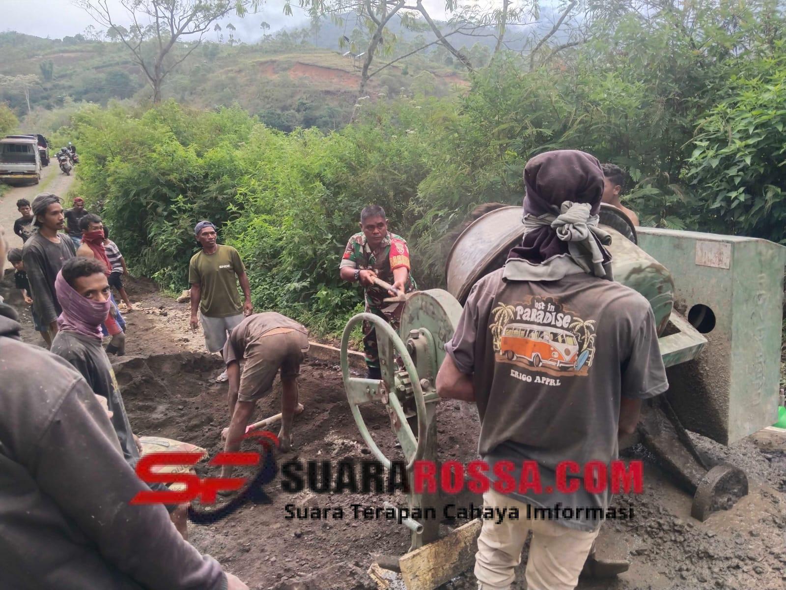 Ende, – Babinsa Koramil 1602-03/Detusoko, Kopka Edwin D. Pay, bersama warga Desa Lisekuru, Kecamatan Lepembusu Kelisoke, Kabupaten Ende, melaksanakan kegiatan karya bakti berupa pengerjaan rabat jalan desa, Rabu pagi.