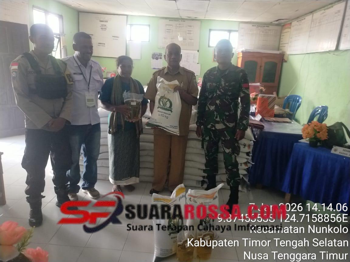 Timor Tengah Selatan — Babinsa Koramil 1621-04/Amanatun Utara, Praka Ivan Dimu, melaksanakan kegiatan monitoring wilayah dan Komunikasi Sosial (Komsos) sekaligus mengawal proses pembagian bantuan pangan dari BULOG kepada masyarakat Desa Nunkolo, Kecamatan Nunkolo, Rabu (07/01/2026).
