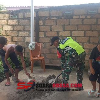 Babinsa Kelurahan Manutapen Koramil 1604-07/Alak, Sertu Domingos Barreto, menunjukkan kepedulian terhadap warga binaannya dengan membantu proses pembuatan campuran semen untuk pengecoran teras rumah warga. Kegiatan tersebut berlangsung di RT 33 RW 11, Kelurahan Manutapen, Kecamatan Alak, Kota Kupang.