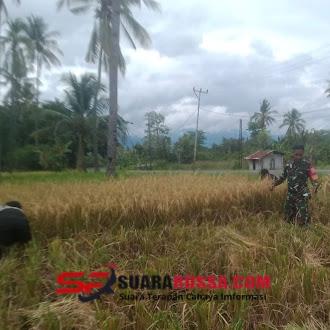 Dalam pendampingan tersebut, Pratu Andreas turut terlibat langsung membantu petani memanen padi di sawah. Proses panen dilakukan secara sederhana dengan peralatan yang masih manual, namun tetap berjalan lancar berkat kerja sama dan semangat gotong royong antara Babinsa dan warga.