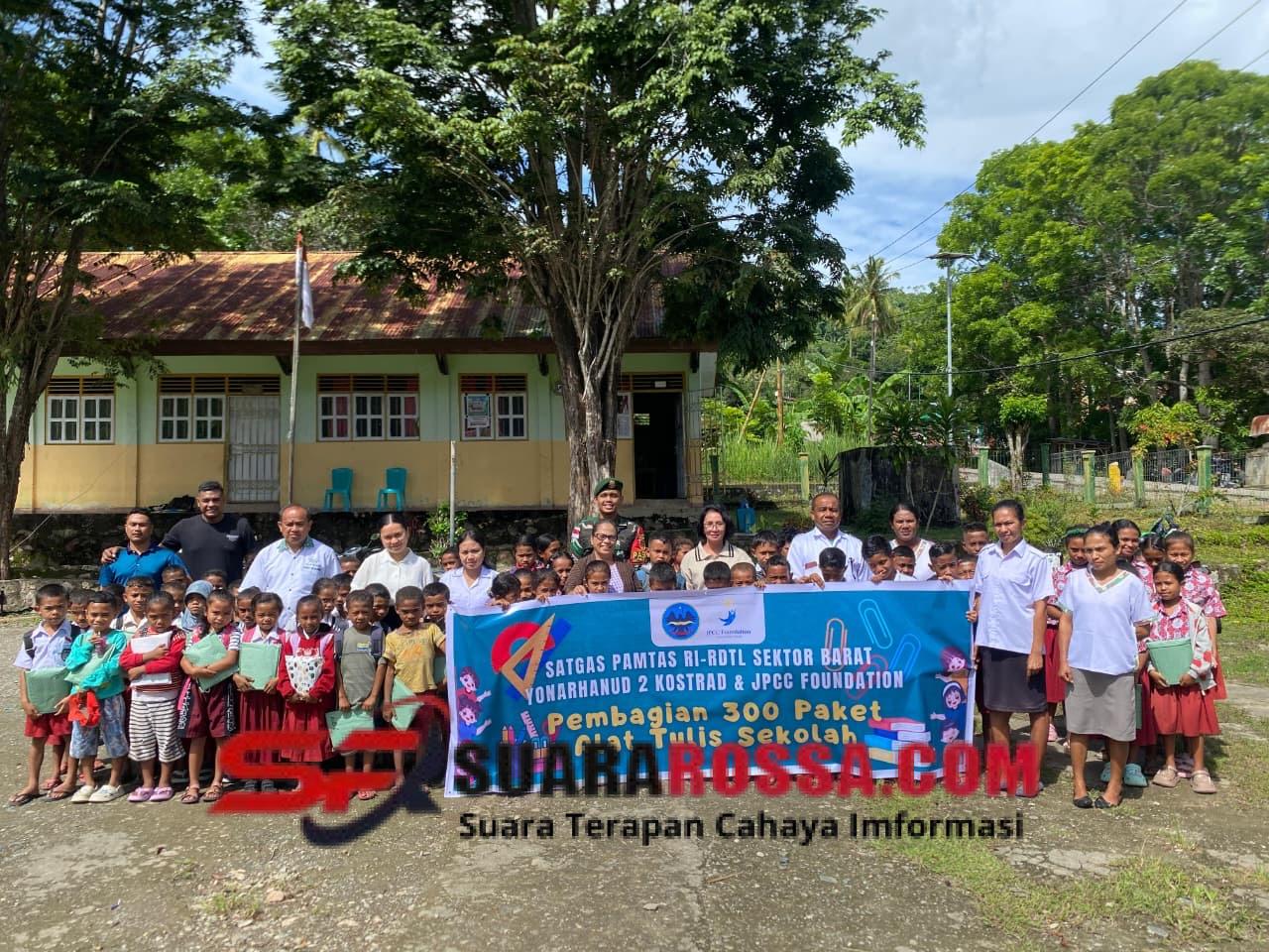 TTU – Satgas Pamtas RI-RDTL Sektor Barat Yonarhanud 2 Kostrad bersama JPCC Foundation melaksanakan aksi kolaborasi pendidikan dengan membagikan 300 paket alat tulis di beberapa sekolah antara lain, SD GMIT Fatunisuan, SDK 2 Eban, SD Fatumfaun, dan SDK Tali Naekake, di Kab. TTU. Rabu (14/01)