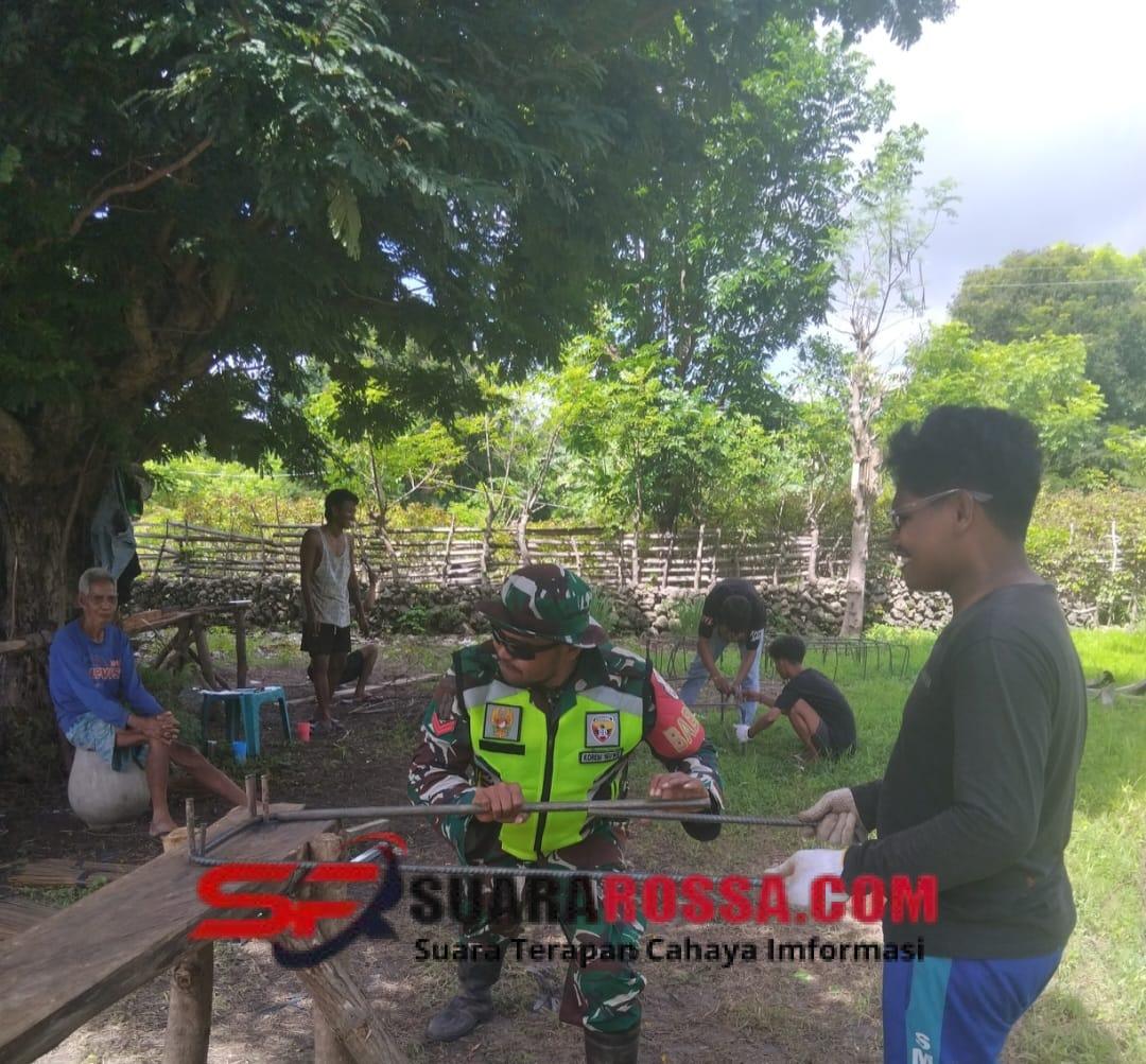 Rote Ndao – Babinsa Koramil 1627-03/Batutua, Koptu Meli Sudarli, melaksanakan pendampingan kegiatan melipat besi dan merakit cakar ayam bersama para tukang di lokasi pembangunan KDKMP Desa Oetefu, Kecamatan Rote Barat Daya, Kabupaten Rote Ndao, Jumat (16/01/2026) pukul 11.30 Wita. Kegiatan ini dilakukan sebagai bagian dari upaya percepatan pembangunan Koperasi Desa Merah Putih di wilayah tersebut.