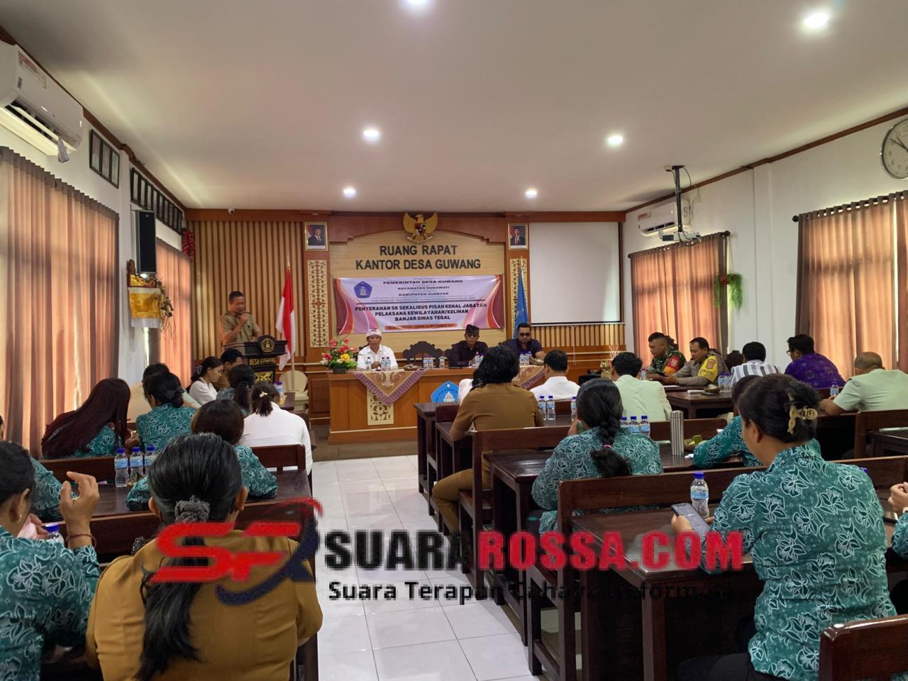 Rangkaian kegiatan inti yang dilaksanakan meliputi pembacaan Surat Keputusan pemberhentian dan pengangkatan Kelihan Dinas Banjar Tegal, penyerahan Surat Keputusan, sambutan dari Pj. Perbekel Desa Guwang, sambutan Bendesa Desa Adat Guwang, serta penyampaian kesan dan pesan dari pejabat lama Bapak I Komang Widarto didampingi istri. Setelah itu dilanjutkan dengan penyerahan berbagai cinderamata dari Pemerintah Desa Guwang, perwakilan Kelihan Dinas se-Desa Guwang, TP PKK Desa Guwang, BUMDes Garuda Wisnu Prabawa, dan Ketua BPD Desa Guwang. Kegiatan berlanjut dengan sambutan serta perkenalan pejabat baru Kelihan Dinas Banjar Tegal, Bapak I Komang Agus Mandela, kemudian ditutup dengan pemberian ucapan selamat oleh seluruh peserta.
