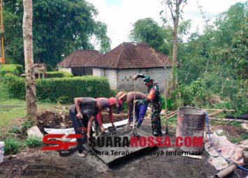 Bangli – Guna meningkatkan fasilitas umum dan mencegah kerusakan jalan akibat luapan air saat musim hujan, Babinsa Desa Kayubihi, Koramil 01/Bangli, Serka I Wayan Suastika bersama warga Dusun Pucang...